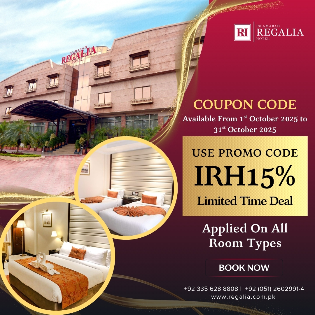 Enhance your stay at Islamabad Regalia Hotel with exclusive deals and special offers. Whether you’re here for business or leisure, enjoy luxurious accommodations, exquisite dining, and premium services tailored to make your experience truly unforgettable.